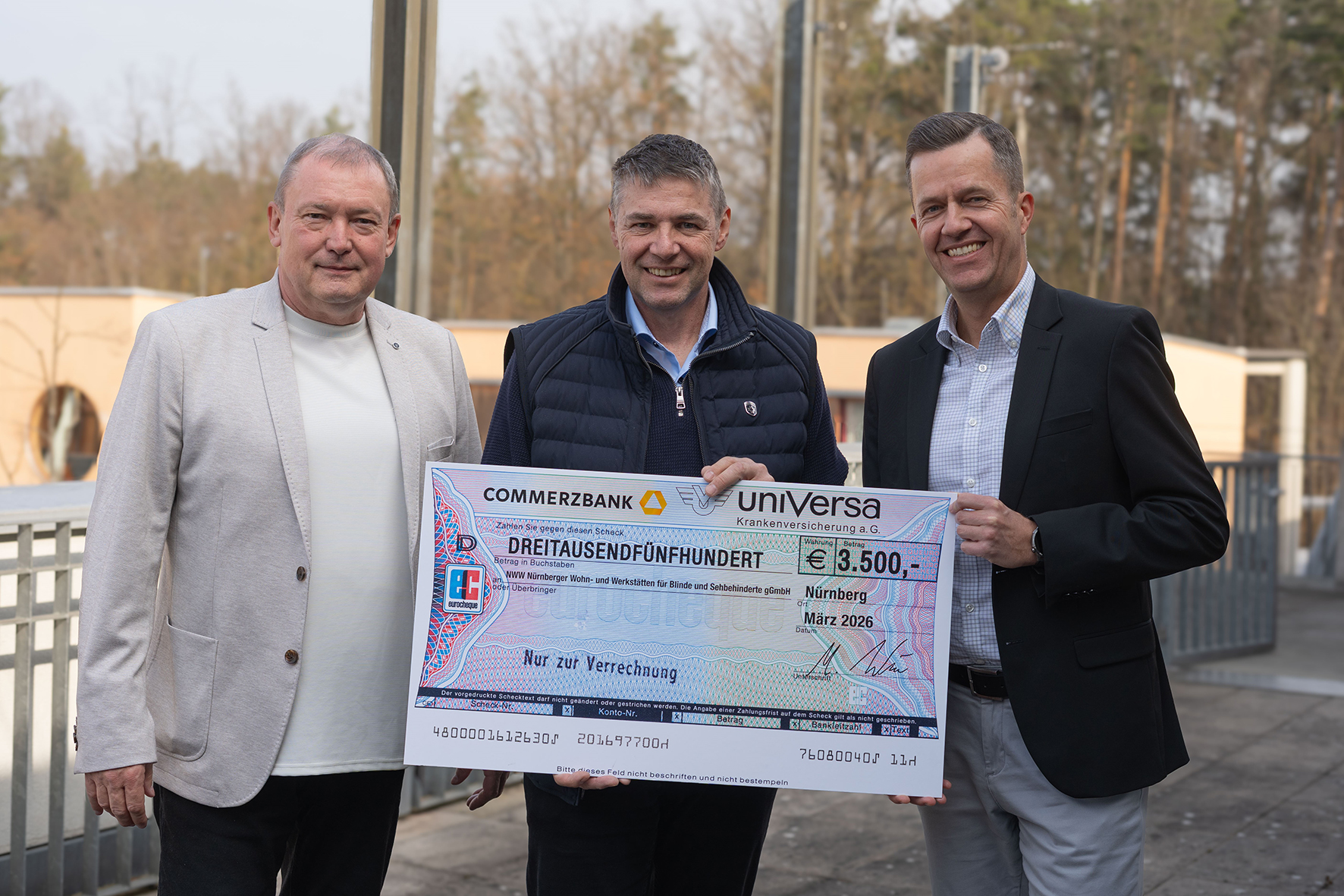 Spende an Nürnberger Wohn- und Werkstätten für Blinde und Sehbehinderte (v.l.): NWW-Geschäftsführer Achim Weiskopf, uniVersa-Mitarbeiter Christian Bach sowie uniVersa-Vorstandsmitglied Dr. Marco Wimmer.